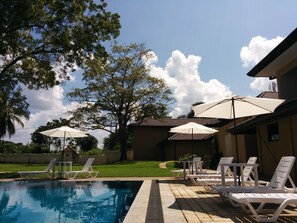 حمّام سباحة خارجي، مظلات على حمّام السباحة، مقاعد للتشمس