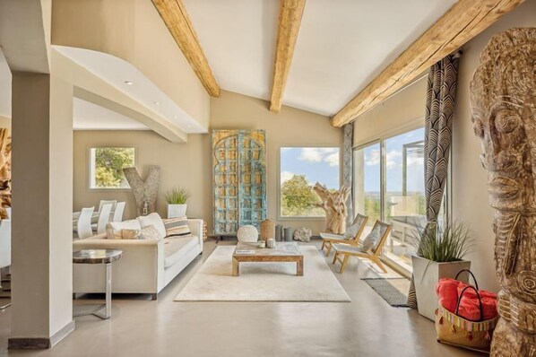 Thoughtfully designed to host up to 14 guests, Villa Tribu unfolds across three generous levels. The heart of the home is the luminous living and dining space, where the eye is drawn through to the superb upper terrace for al-fresco dining overlooking the village and distant Mediterranean coast. The wonderfully equipped kitchen is modern and sleek whilst there is a TV lounge with Netflix for relaxing time away from the sun.