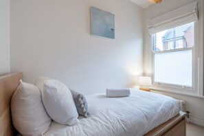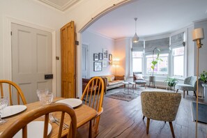 This classic Victorian house features an open-plan living and dining area on the ground floor, with large bay windows that let in plenty of natural light. Upstairs, you’ll find two double bedrooms and two single rooms, all with soft wool carpets for a warm, comfortable feel.