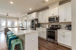 KITCHEN: Fully equipped, coffee maker, dishware and flatware, dishwasher, large kitchen island, breakfast bar, tile backsplash