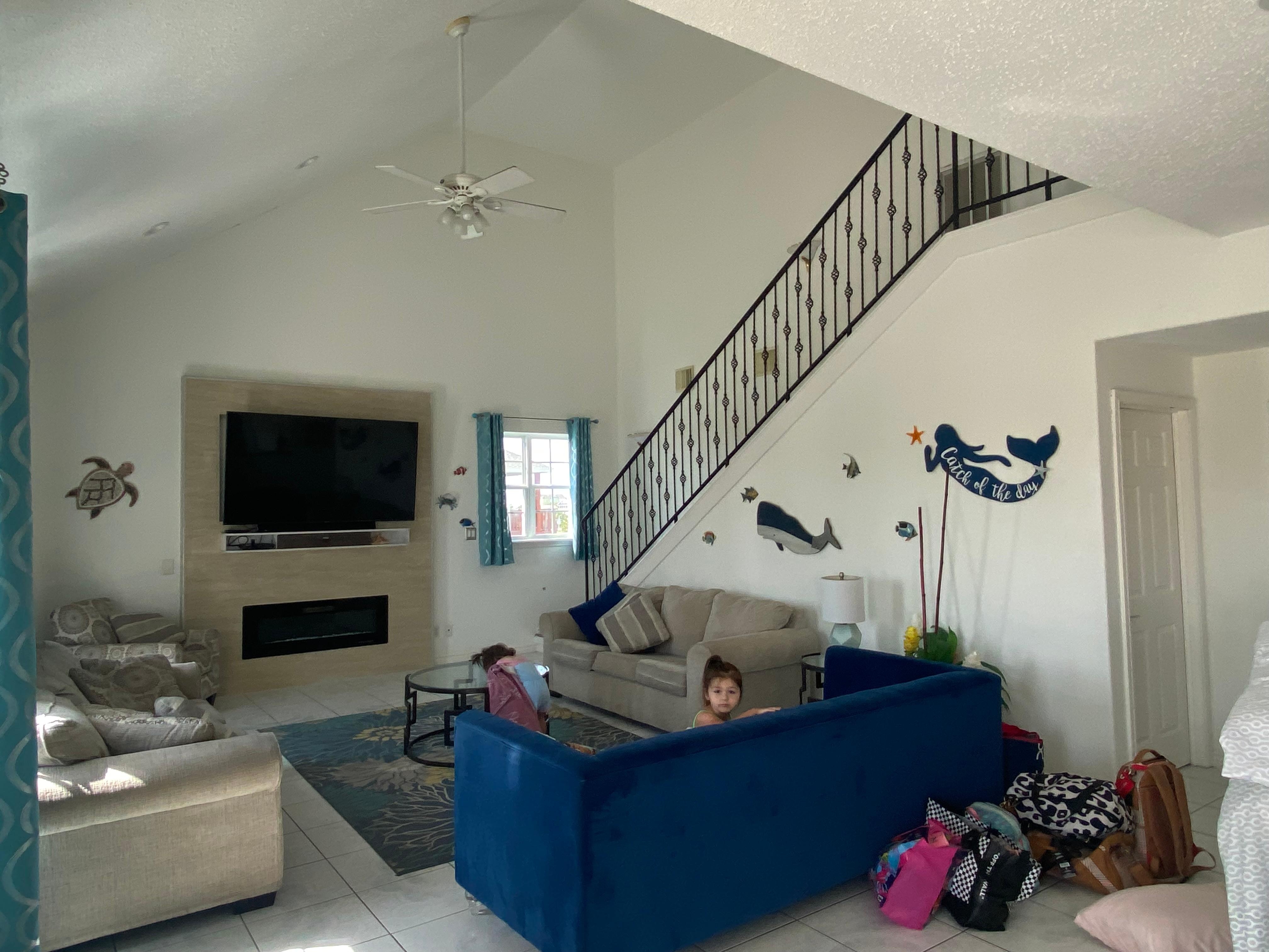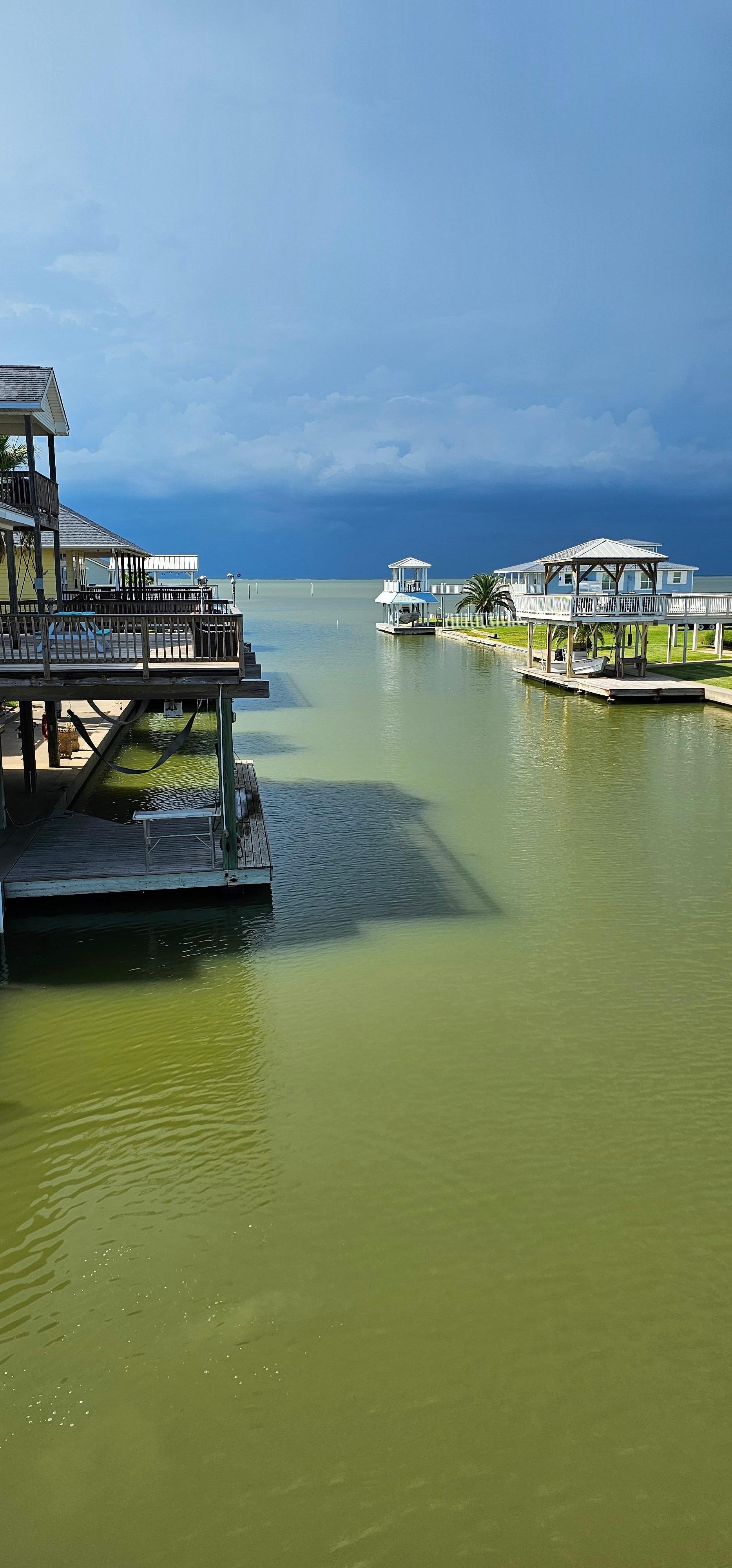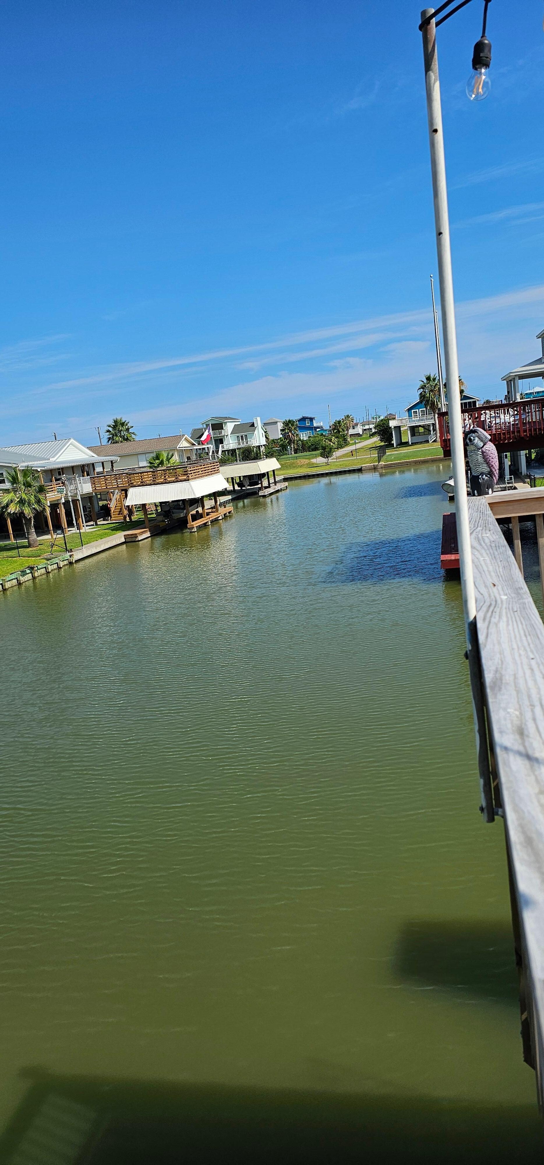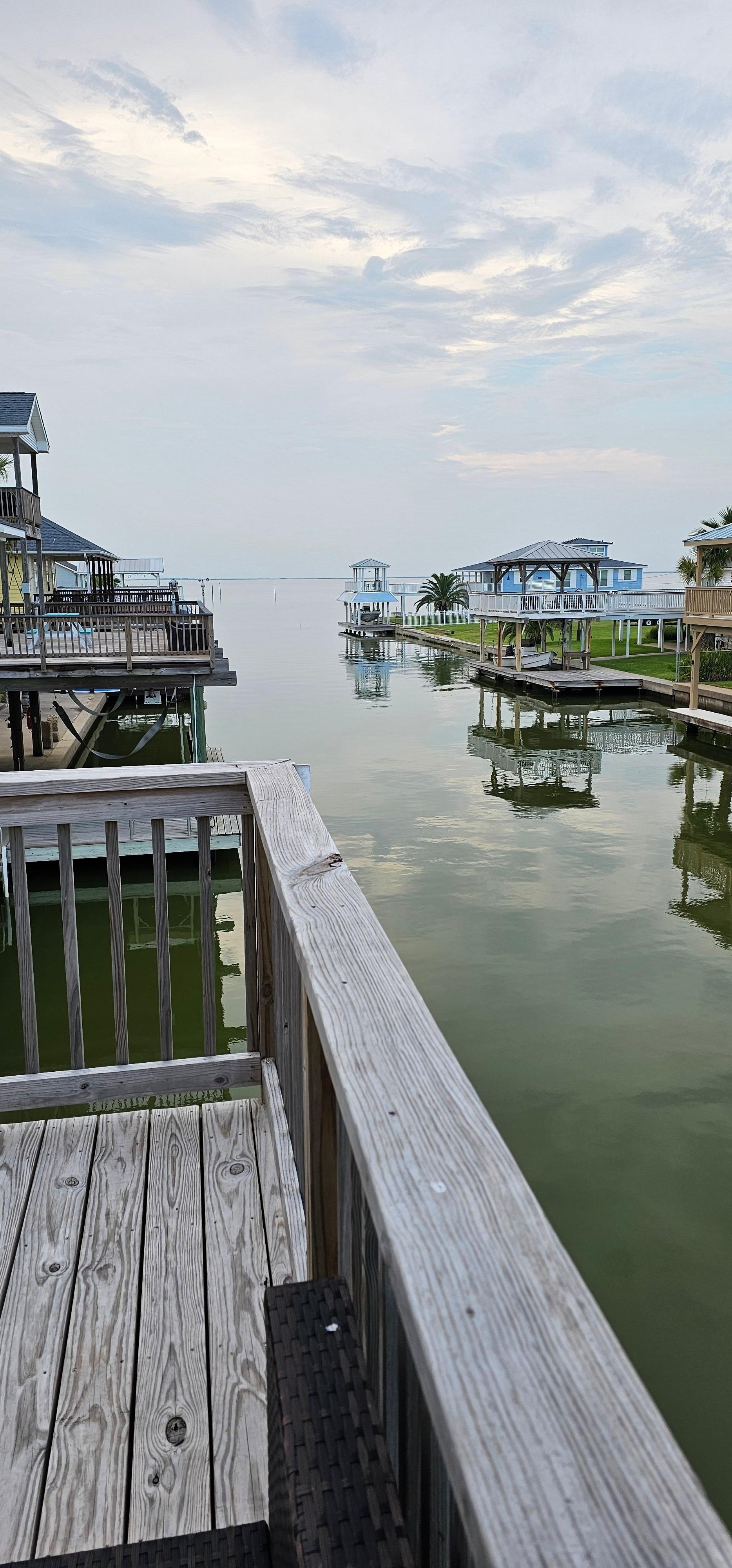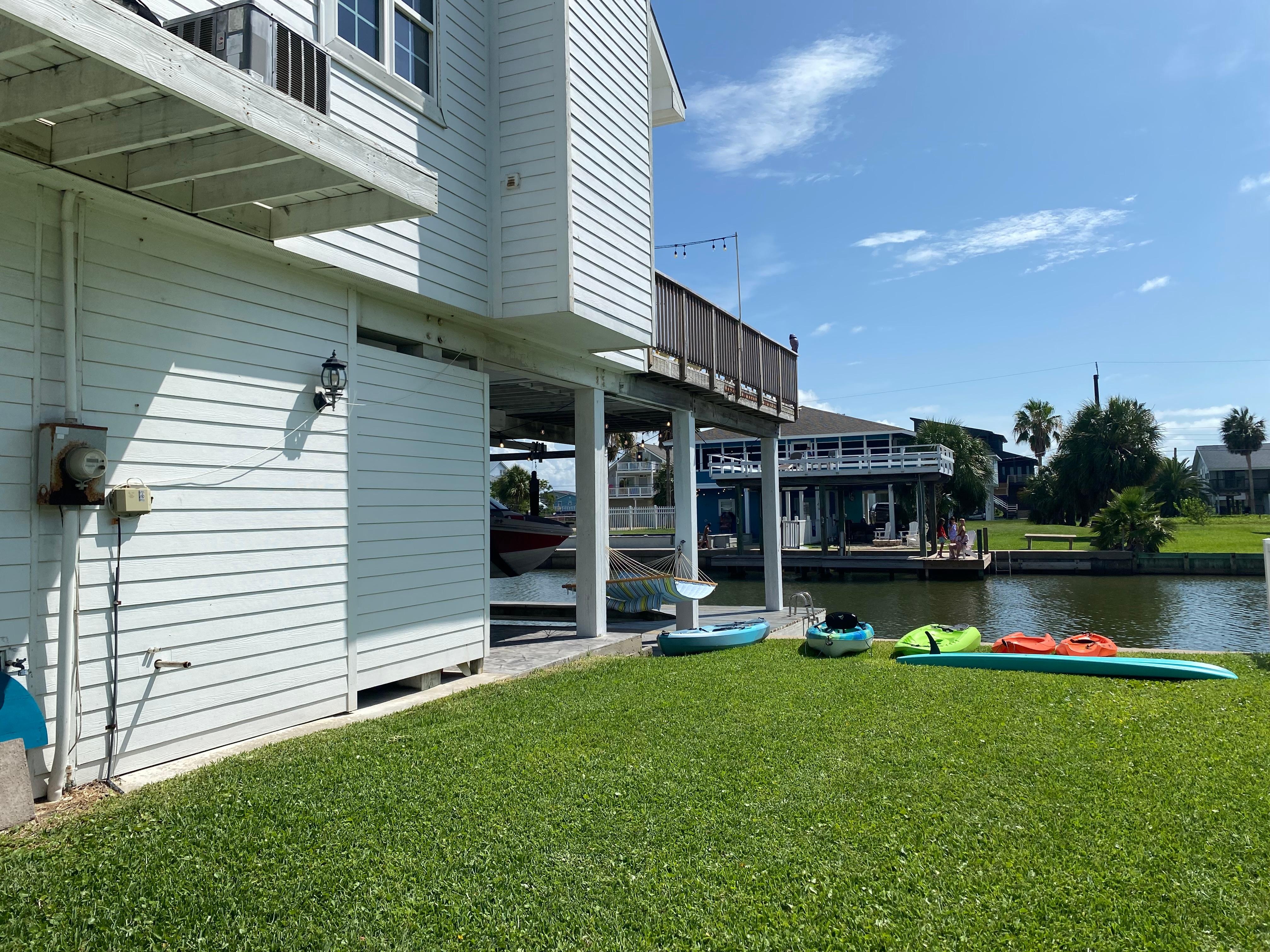 Enjoy breathtaking water views from virtually all corners of the house, along with beautiful sunrises/sunsets from the decks in any of the three bedrooms, or head down to the lower deck where you can catch a wide variety of fish, crabs, or grab a kayak or paddle board and spend part of your day out on the clam, pristine waters. Upstairs you will find a newly updated living area with 3 bedrooms. The master bedroom on the third level has its own private balcony and spacious en-suite bathroom with a balcony where you can watch the gorgeous sunset. The second bedroom has a queen bed. The third bedroom perfect for kids has a twin over full bunkbed, and another twin over twin plus trundle bunk. Queen-size folding bed and the living room sofas can be used for sleeping extra guests. The main deck provides plenty of space for entertaining. A light in the canal right in front of the house allows for viewing of fish during the nighttime hours. Garage downstairs serves as a game room where you can challenge family or friends to a round of ping pong or darts. The community boat ramp, pier and pavilion are conveniently located right across the street from the house. There is plenty of parking on the driveway and on the street for larger groups. You are only a 3 minute drive away from Bay Harbor beach. The very beautiful, untamed white sand beaches and sand bars along the San Luis Pass, where you can drive your car or 4-wheel vehicles, is a popular fishing spot and is only 9 mins away. For added convenience, a short drive will also get you to the local grocery store, bait shops, gas stations, and restaurants.