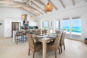 The fully equipped kitchen features custom cabinetry, stainless steel appliances, dishwasher, quartz counters, plenty of indoor and outdoor dining ware, utensils, bar tools, cookware and pots/pans. The 8’ island has a separate beverage fridge and counter seating and is the perfect spot to set out a spread of snacks, a puzzle or to enjoy being in the center of the cooking action. A path off the deck leads to a nearby outdoor bbq area where you can grill your steaks or fresh caught fish while taking in water views. With indoor and outdoor dining areas, you can choose where to enjoy one of the most panoramic views Exuma has to offer.