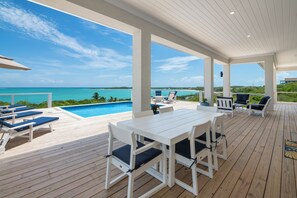 The expansive outdoor deck area was designed for entertaining and relaxing! The veranda provides the perfect shaded area to enjoy the views as well as a spot for alfresco dining or lounging on the outdoor sofa and chairs. Or step out into the sun towards the heated, saltwater pool and sundeck. This area includes an umbrella, chaise lounges, and a conversation seating area with Adirondack chairs and a table. The seating ledge of the pool is the perfect spot to bask in the warm Caribbean sun with a cool drink in hand.