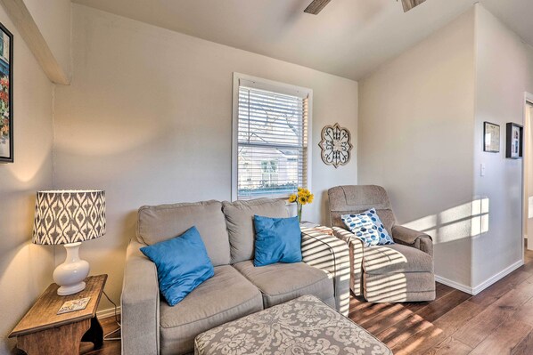 - A bright living room with sofa bed, dining area and fully-equipped kitchen.