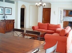 Outside, you can enjoy a shared garden with garden furniture, as well as a private terrace. The property also has two shared pools, one of them heated, perfect for cooling off on sunny days.