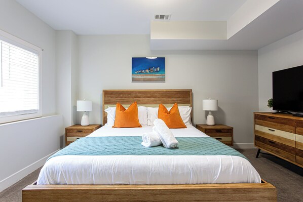 Venture into the bedroom, where a queen-sized bed adorned with luxurious linens promises restful nights. The in-suite bathroom features a spacious shower, offering a rejuvenating retreat after a day of exploring the nearby beach and local attractions.