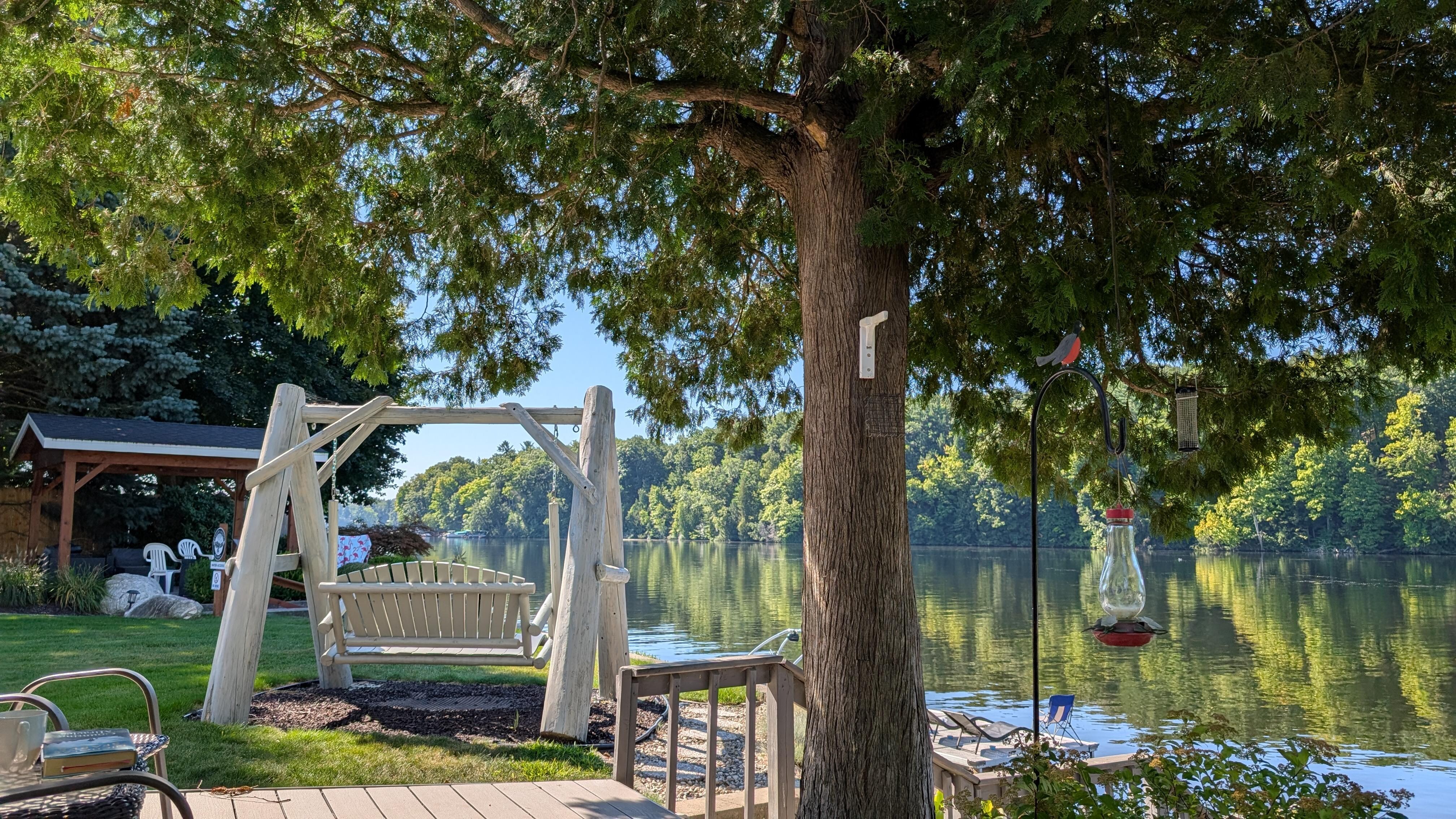 This Immaculate 1200 sq ft cottage is only a 50 minute drive north of Grand Rapids and is located on the beautiful 1350 acre Croton waterway (between the Croton and Hardy dams). Completely remodeled with white kitchen, quartz counters, bright new bathroom with seated shower, 2 bedrooms (each one with a queen bed ), 2 sitting areas (one with a queen size sofa sleeper and the other with a large gray sectional that seats 6). Our open floor plan cottage has a beautiful dining area with vaulted ceiling and a large, expandable table that seats up to 10, offering panoramic water views with its surrounding windows. Relax on our large wrap-around deck and enjoy the breeze that comes off the river, but if it gets too warm, escape into the comfy cottage with central air conditioning. Chill at the fire pit or fish along our 100 feet of sea wall frontage with 2 docks. Sway on our beautiful waterfront swing as you sip your morning coffee and look for the majestic bald eagles who nest in the treetops just across the river. Enjoy 5 bikes that are available for your use and ride them along the roadside bike path that extends from the Croton Dam to the Hardy Dam. There are also 6 kayaks (Five adult-size and one youth size) available at no charge and a pontoon available for rent. Gorgeous retaining walls and numerous outdoor activities in the area make this cottage the perfect place for your family to relax outdoors and enjoy the perfect location on the river.