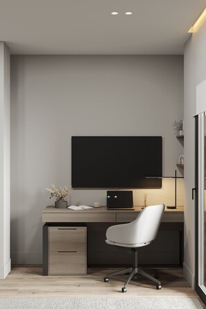 The living area combines modern design with comfort, featuring a 65” Smart TV