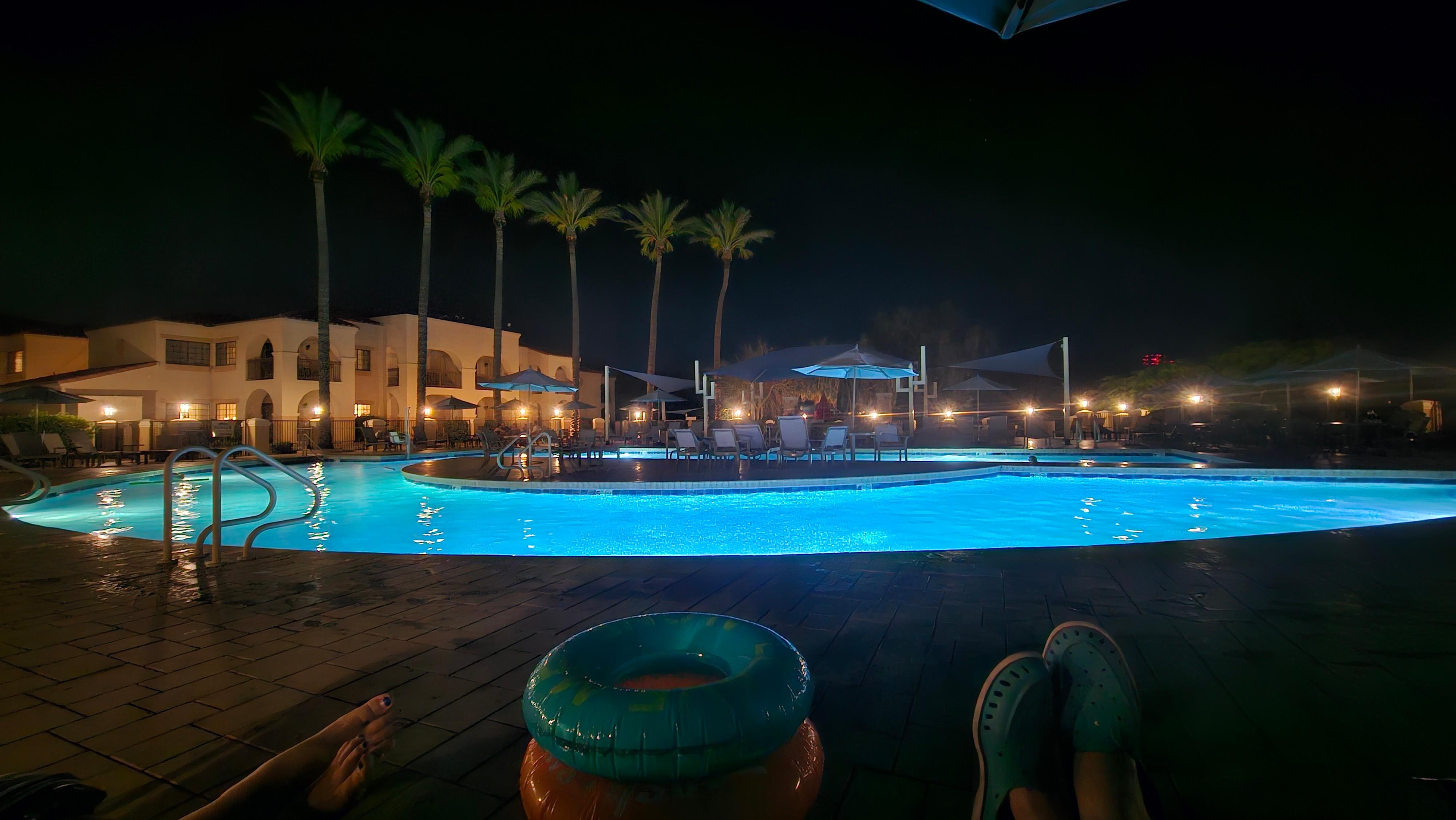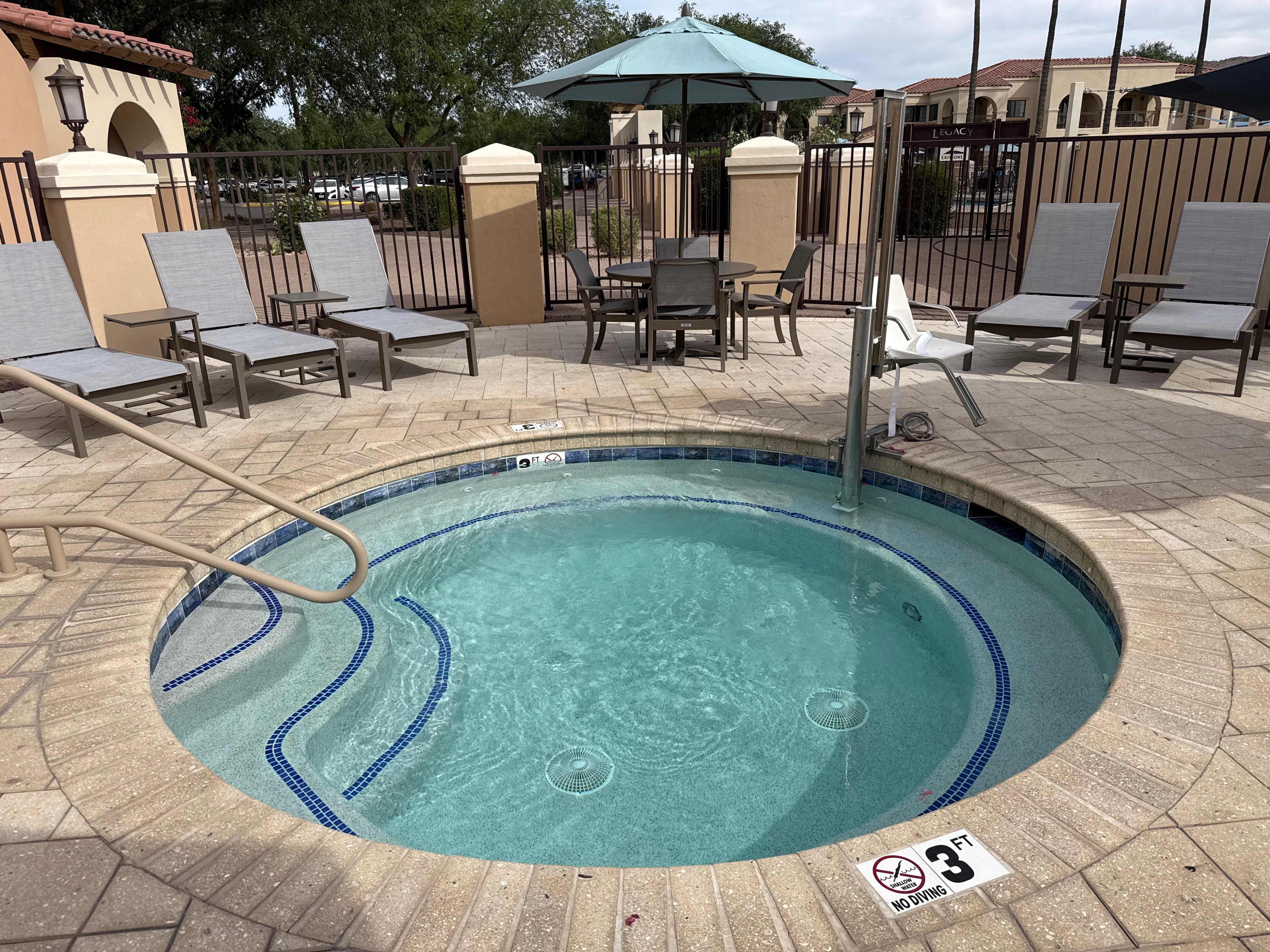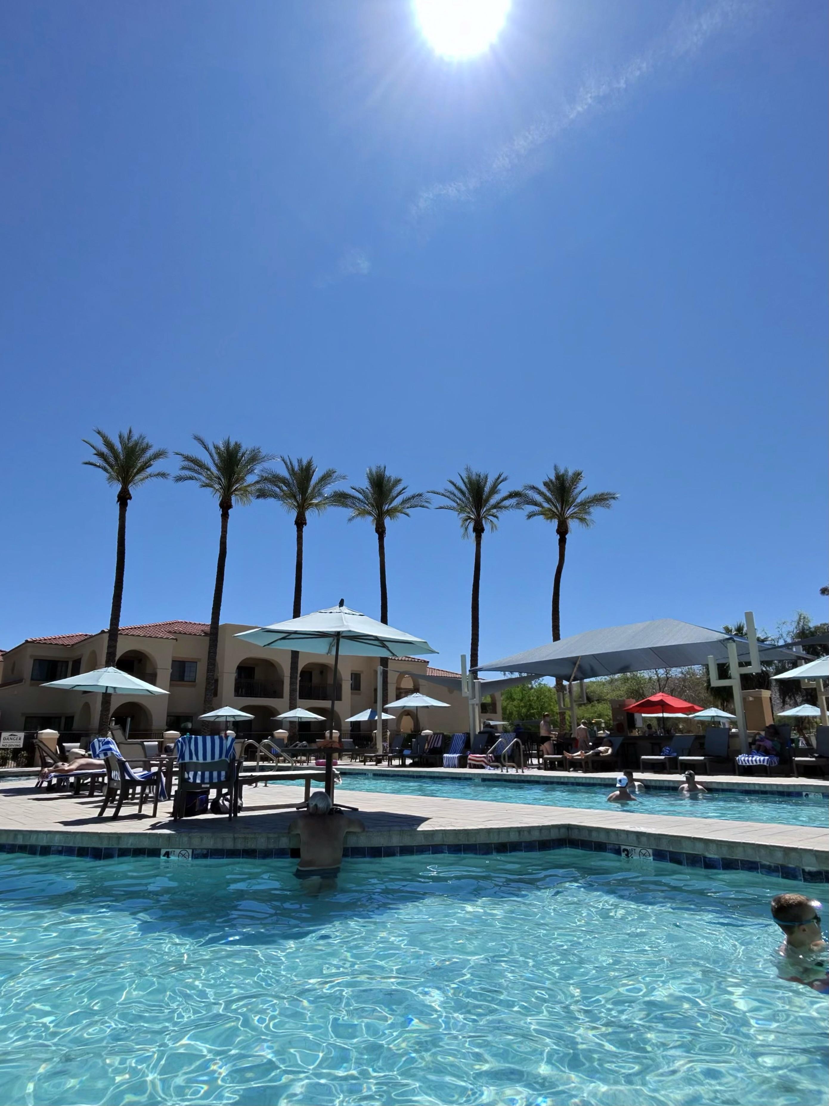 حمّام سباحة خارجي، مظلات على حمّام السباحة، مقاعد للتشمس