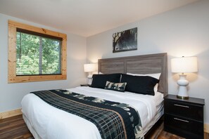 ★ Master Bedroom - King Bed on the upper level with 43` Smart TV, Walk-in Closet, Chairs, and Table and Ensuite Bathroom