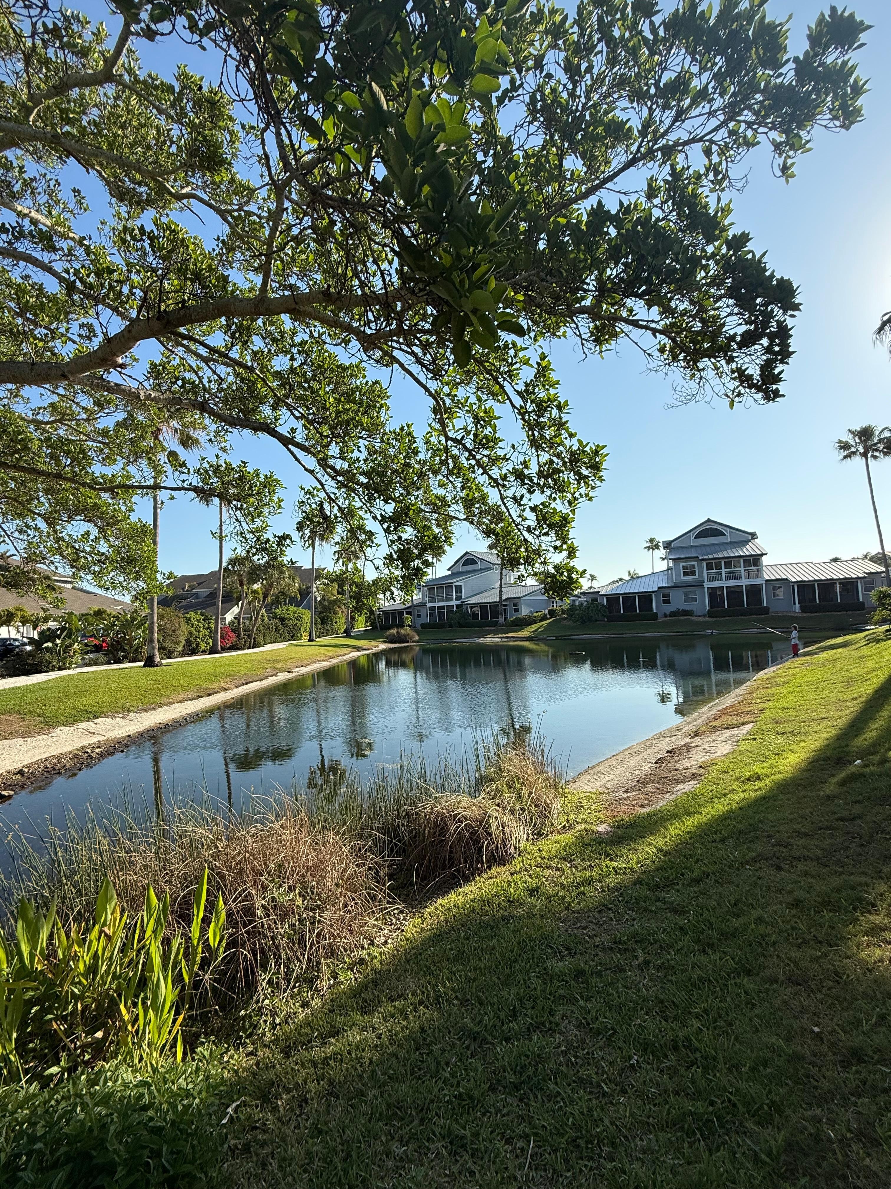 - Water Views: Screened lanai overlooks a tranquil fountain pond and manicured tropical landscaping.