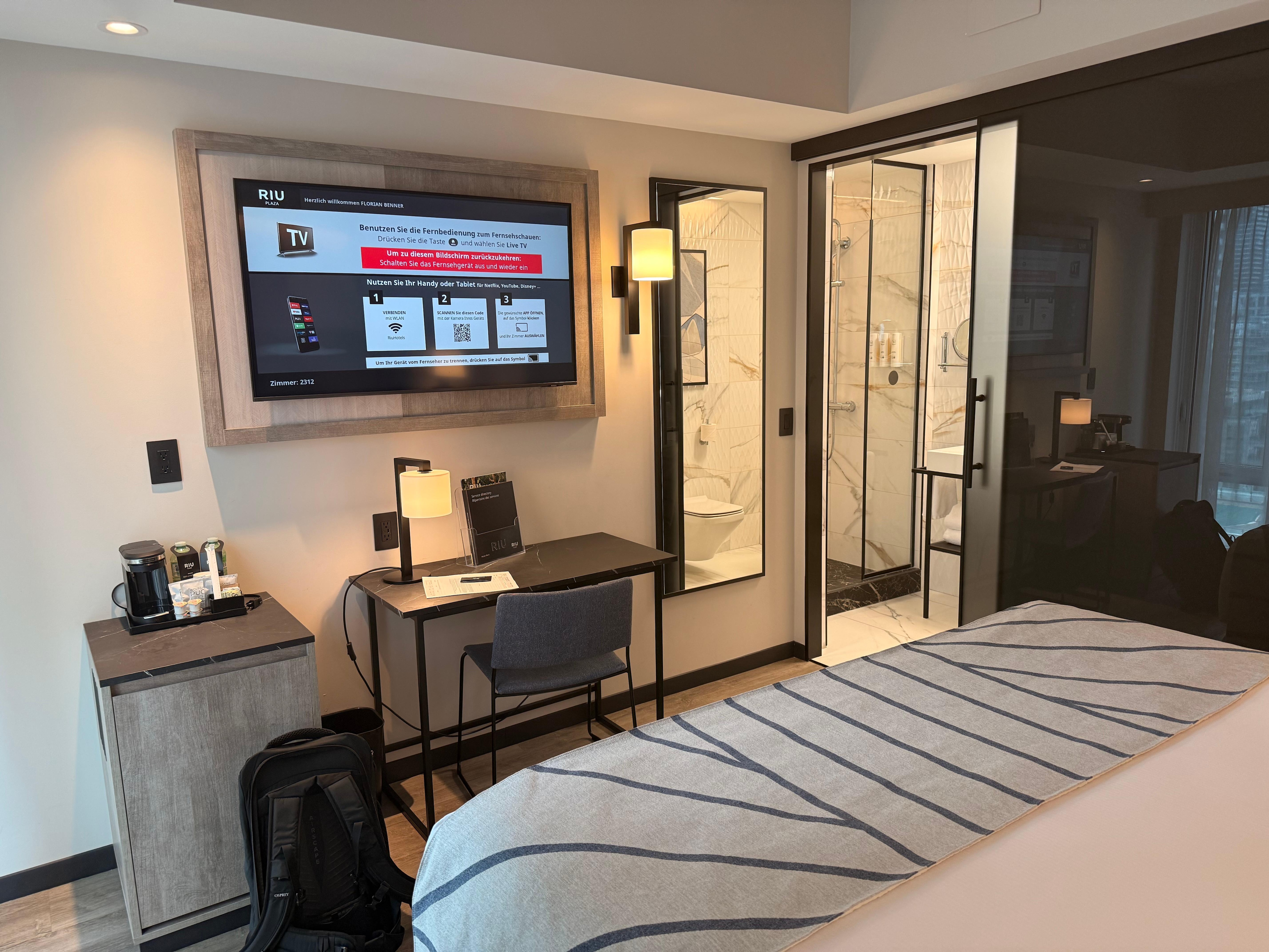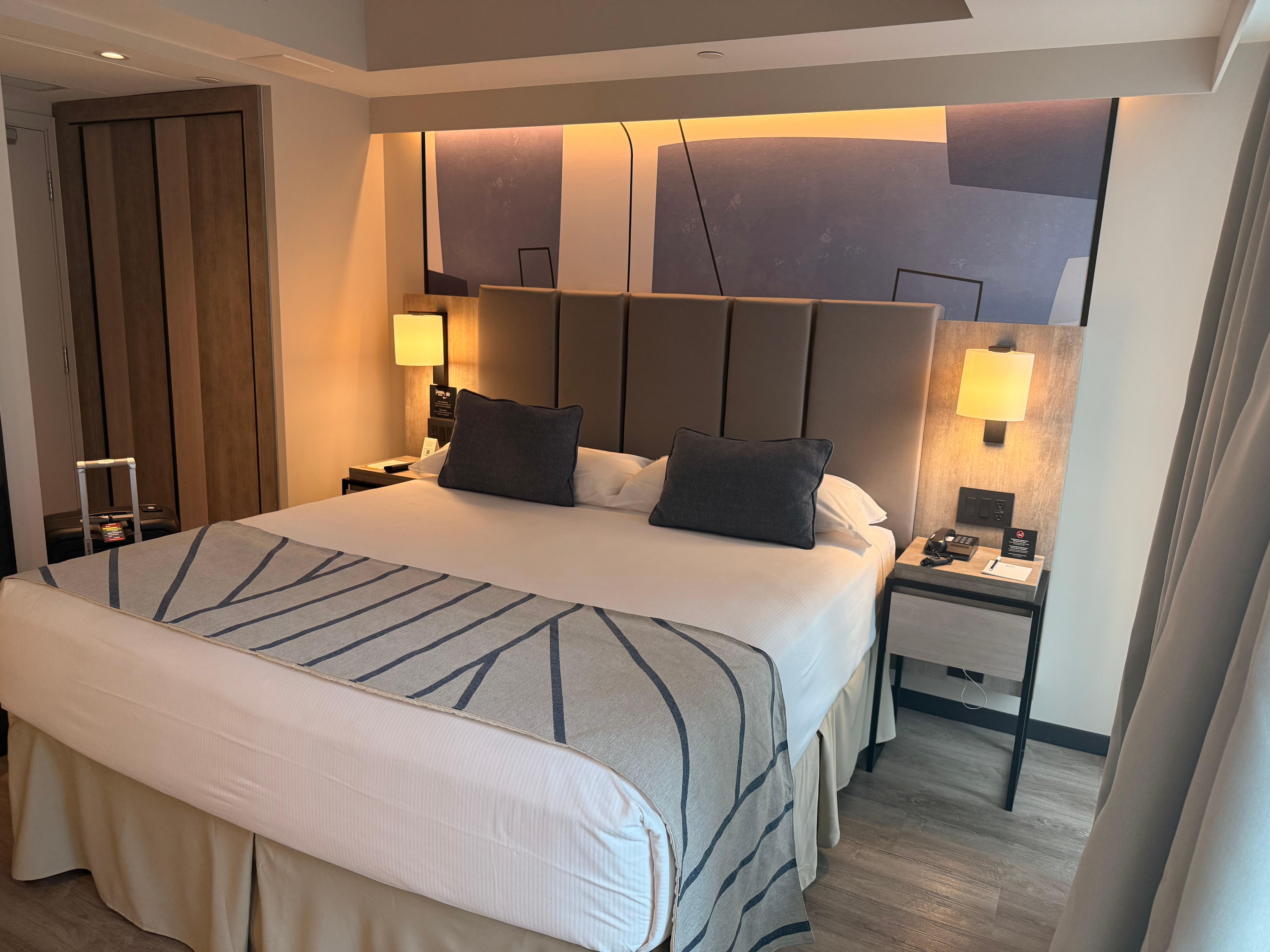 أغطية فراش متميزة وخزنة داخل الغرفة ومكتب وستائر تعتيم