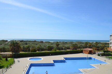 Flat with two bedrooms and two bathrooms, in first line of beach with communal swimming pool and parking space included in the price, sea and general view, fully equipped. Terrace and garden furniture. Lift, bed and bath linen, dishwasher, plasma TV, complete kitchenware, conventional oven and microwave, coffee maker, toaster, everything you need to feel at home.