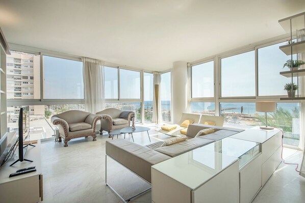 Spacious, sunny Diagonal Mar apartment of 110m2 right in front of the beach of Barcelona! Beautiful comfortable apartment with lots of natural light, is fully furnished and equipped to accommodate all your vacation or business needs. The apartment is located only 15 minutes by metro from the historic city center or 15 minutes taxi ride. Enjoy the convenience of this fully equipped apartment overlooking the beach. Spacious living room features ceiling-to-floor windows overlooking the sea. There are 3 double bedrooms: a master double bedroom with en-suite bathroom and two bedrooms with twin beds. Two bathrooms are complete bathrooms with shower and a bathtub. The kitchen is fully equipped with all necessary appliances (fridge, dishwasher, microwave, kettle, toaster, coffee maker). In the laundry room you will find a washer and a dryer, iron and ironing board. There's also a small balcony with sea views where you can enjoy a glass of wine on a sunny Barcelona day. Linen and towels are provided by the property. Baby cot and high chair are available upon request. The apartment is located in a quiet residential building, so parties or loud events in the apartment are not allowed. There is an elevator in the building.