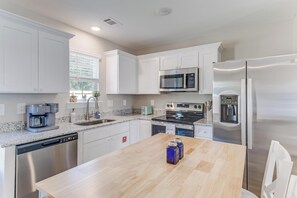 • Kitchen: Fully stocked with pots, pans, dishes, utensils, and appliances, including a toaster, coffee maker (drip, no pods), microwave, refrigerator/freezer, dishwasher, and beautiful granite countertops.