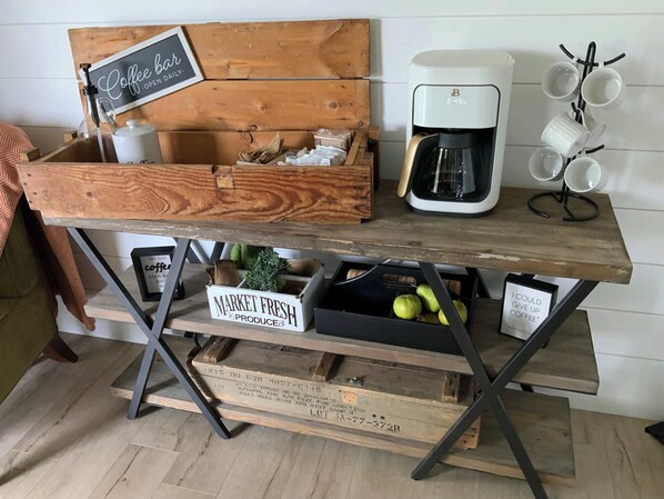 The fully equipped kitchen is small, but a culinary haven, complete with everything you should need. Prepare delicious meals with ease and enjoy them at the adjacent dining area, where a dining table awaits. Whether you're savoring a romantic dinner or having a quick bite, the ambiance created by the lakefront backdrop adds an extra touch of magic to your dining experience. Included is a wonderful coffee bar with all the fixings!