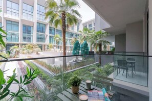 Step out onto your private balcony and enjoy a serene view of the pool area from the same level — the perfect setting for a quiet morning coffee or a relaxed evening wind-down.