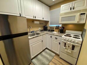 Studio apartment with a smart TV with Wi-Fi. Small adequate kitchen with dishes for 4.