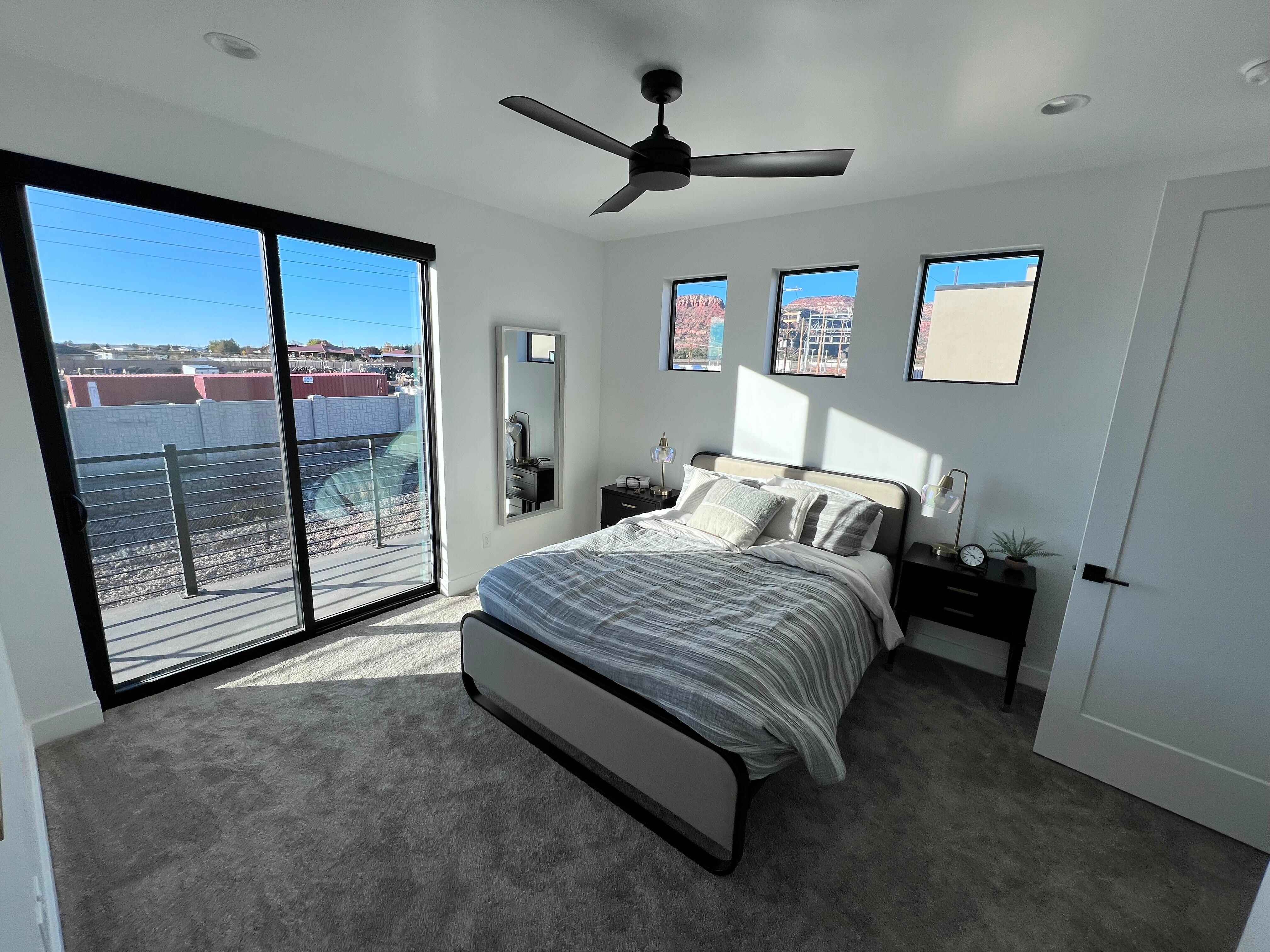 The primary suite is located on the main level and has a King sized bed and large sliding doors that lead you right out onto the back patio where you can relax while you enjoy a cup of coffee in the morning and watch the red hills light up under the rising sun, or relax in the evening as you view the magnificent sunsets and unobstructed starry skies of Kanab! This room also offers a large walk in closet for clothes storage. The ensuite bathroom in the primary bedroom features a walk in luxury shower with a built-in shower bench, and a double vanity.