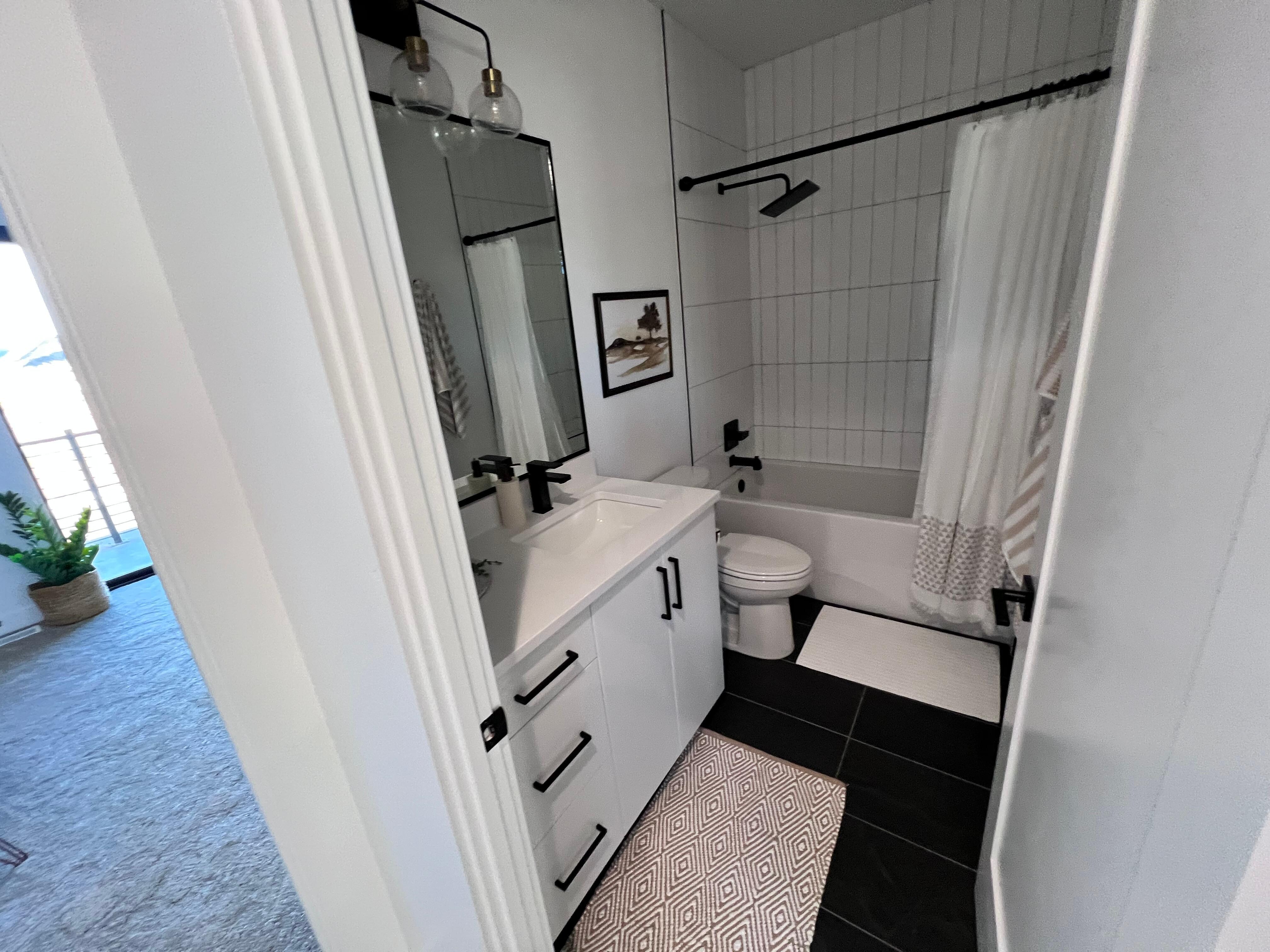 At the top of the stairs, and between the two bedrooms, you will find the gathering area. Enjoy a comfortable couch, additional chairs, and a flat screen Smart TV. A laundry room with full capacity machines is located upstairs, as well as another full bathroom featuring a tub/shower combo with beautiful tile.