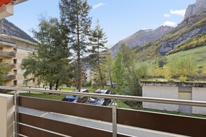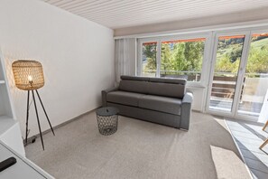 La grande pièce à vivre est divisée en deux espaces grâce à un meuble séparateur : d`un côté, un lit escamotable pour deux offre un espace nuit confortable, et de l`autre, le salon comprend un canapé-lit pour deux autres personnes ainsi qu`une TV pour vos moments de détente. Vous trouverez également un coin repas convivial, une salle de bain avec douche, et une cuisine entièrement équipée. Le balcon, avec vue sur les montagnes, est aménagé de deux chaises, une table et deux chaises longues pour des moments de relaxation en plein air.
