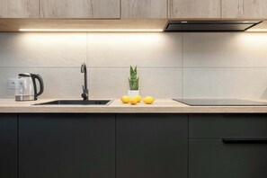 Induction hob, dishwasher, fridge, electric kettle, microwave, kitchen utensils, tableware