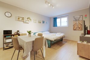 Cozy and modern 30sqm studio apartment, able to comfortably accommodate up to 2 people, located in the basement of a building WITHOUT a lift (steps to access it). The apartment is located in a strategic position, just a 5-minute walk from the Affori st