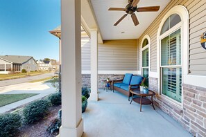 Back at your stay, rinse off in the outdoor shower before heading inside. Upon entering, you will immediately fall in love with the home's chic nautical theme and effortless layout. The den offers a quiet spot for remote work, whereas the expansive living room and kitchen display the perfect space to entertain your favorite people. Cuddle up and enjoy each other's company in front of the living room's fireplace. When you get hungry, the chef's kitchen makes cooking a breeze with its granite countertops, stainless steel appliances, and large center island. When it's time to eat, gather around the breakfast bar, the in-kitchen dining table, or alfresco with pond views on the patio.