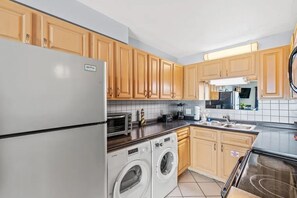 The living area offers a relaxed, beachy vibe with comfortable seating, cable TV, and central A/C. Step onto your private balcony to sip coffee while taking in ocean breezes and endless views of the Gulf. The kitchen includes a stove, oven, microwave, refrigerator, and dishwasher—fully equipped for light cooking during your stay. You’ll also find an in-unit washer and dryer for added convenience, fresh linens provided, and easy access to the building’s elevators and resort amenities just downstairs.