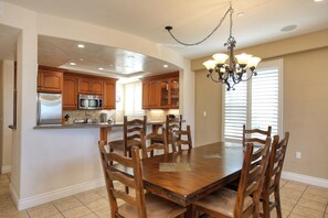 Cozy Living Area: An indoor gas fireplace, flat-screen streaming-ready TV with HD basic cable, and a dining table with seating for six.