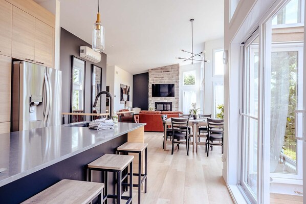 Escape to the heart of nature at this bright and spacious modern chalet, perfectly set on the peaceful banks of the Rivière Rouge. Located just 30 minutes from Mont-Tremblant and only a few minutes from town, it’s the ideal place to unwind with friends, enjoy quality time as a family, or host a relaxing team getaway. With a large spa, pickleball court, outdoor fireplace, and plenty of indoor games for rainy days, this retreat is built for comfort, connection, and fun—all year round.