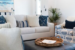 Living Room: Large sectional with pull-out Queen sleeper, 2 chairs with large ottoman, large TV, console table, corner reading chair, entryway table, and ceiling fan.
