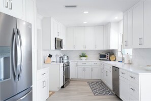 Kitchen: Stainless steel refrigerator, stove/oven, dishwasher, microwave, toaster oven, 4 slice toaster, blender, coffee station with coffee maker & Kuerig, dish hutch, island with 3 barstools, ceiling fan, sliding door to the pool area. Basic dishes, cookware, and utensils are also provided. Basic spices and cooking oil are not always available.