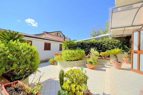 The terrace is 10 square meters (107 square feet) large. It is partly shaded. It is equipped with a table and chairs. From the terrace you will have a view of the surrounding buildings and, partially, of the sea.