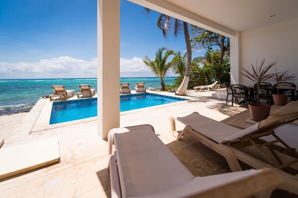 The 3,500 squ ft Main Villa is open and airy with uninterrupted views of the beach and Caribbean Sea. The open large open design of the main level highlights the expansive ocean views and is designed to allow an easy and seamless flow from the main living areas, through to the pool, patio and sundeck and then on to the sandy beach and gentle turquoise waters.