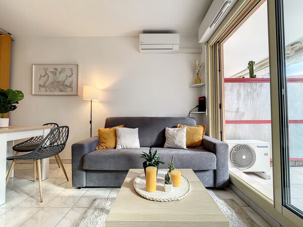 L'appartement est composé d'un salon équipé d'une climatisation réversible, avec canapé convertible 140cm et coin salle à manger, une TV, une grande cuisine toute équipée, une chambre climatisée également et rangements, une salle de bain avec douche et un WC.