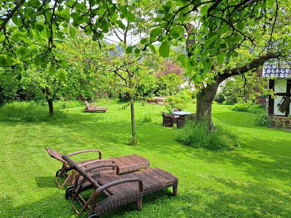 A spacious garden with herbs for fresh cooking as well as many different fruit trees, sun loungers and a newly created garden sauna invites you to relax, read and barbecue and is shared with the guests of the other apartments.