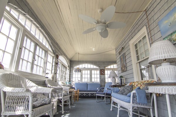 You may freely enjoy long walks on the beach since the walk to it is short and sweet. There is a cozy second story sun deck offering an ocean view and that refreshing salted sea breeze. The backyard is perfect for picnic lunches and BBQ dinners. There are six bedrooms (and a few hidden nooks to stowaway guests of guests), kitchen, dining room, living room and a small laundry room in the rear with new appliances. However you'll likely spend most of your time relaxing on our wraparound front porch where time stands still.