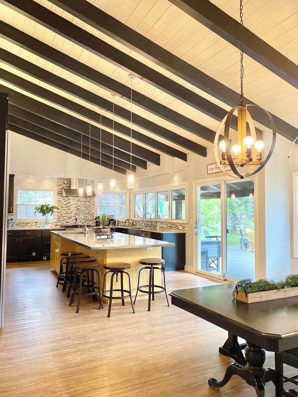 KITCHEN - large open vaulted beamed ceiling gourmet kitchen perfect for serving a large crowd or small intimate gathering. It includes a large stainless steel island with stools for 6, a professional 6 burner Dacor range/oven, a built-in Kitchen Aid convection microwave, and 2nd oven, two sinks, each with instant hot and the main sink with REVERSE OSMOSIS water dispenser. Large built-in refrigerator plus sliding door pantry. The remaining kitchen counters are slab granite and the kitchen includes every cooking amenity imaginable, not to mention a fully stocked coffee corner with complimentary local coffee. The kitchen overlooks the backyard playground, patio and hot tub area with large windows, a sliding glass door to back patio and a sliding Nana window to create an incredible outdoor room experience.
