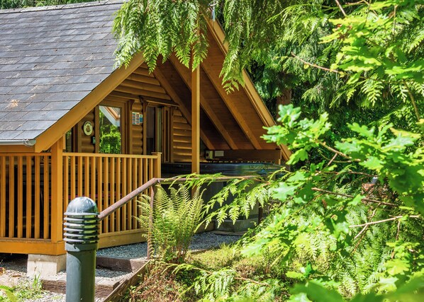 Timber lodge set in an elevated woodland position with one master double with en suite shower, one double and one twin. Bath with overhead shower. Dishwasher. Outdoor hot tub on the verandah. No pets.. Bulworthy Forest Lodges is tucked away down a picturesque tree-lined drive leading to Bulworthy Forest in heavenly North Devon. Nestling in 25 acres of woodland teeming with flora and fauna, and boasting four recreational fishing lakes, this is the consummate setting for escaping to the country and losing yourself in perfect peace and good old-fashioned family fun.