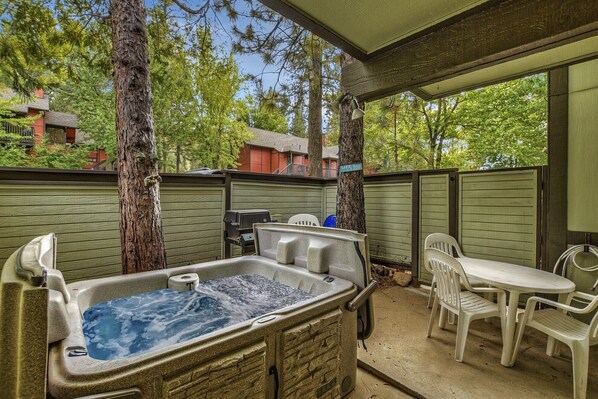 Just off the dining area, you'll find a porch with a hot tub, perfect for soaking after a day of adventure. The porch also includes a table with chairs and a grill for summer barbecues, allowing you to enjoy the beautiful Big Bear weather and mountain views.