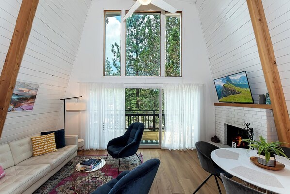 The main living space at Summit View Treehouse offers a light and airy experience with vaulted ceilings, beam accents, and plenty of natural light from glass sliding doors and picture windows. Cozy up on the plush leather couch or sitting chairs while warming up by the wood-burning fireplace. The quaint dining, kitchen, and living space flow together seamlessly, allowing your group to gather while cooking a delicious meal or enjoying your favorite movie on the Smart flatscreen TV. Step outside through the glass sliding doors to the upper deck, where you can sip your morning coffee among the pines.