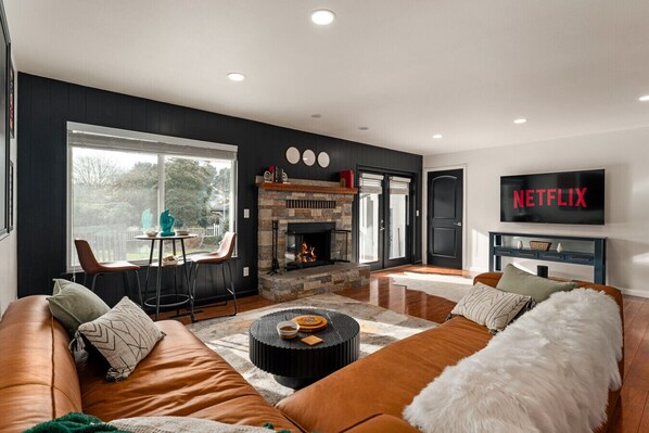 The main floor is all about togetherness, with a bright kitchen and dining area that encourages guests to sit, share, and stay awhile. Instead of a TV, you’ll find a board-game wall and open layout that fills with laughter, conversation, and creativity.