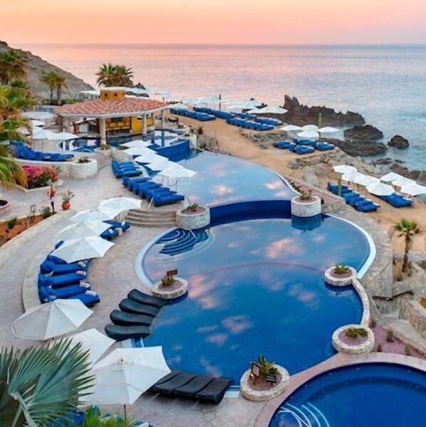 Imagine a destination where luxury and traditional are in harmony. Perched on a cliff with stunning ocean views, Mexican art and architecture to create an authentic Baja experience. Luxurious suites are artfully designed. Lounge by 1 of the 3 outdoor pools or hot tub with poolside bars, or immerse yourself in serenity at our holistic spa. Sport zones showcase basketball, volleyball and tennis/pickleball courts, fitness center and gym, putting green, and pool games. Family centered areas include kids club and water playground, and babysitting. Room service is 24 hours, hourly shuttles to Los Cabos. Say "I Do" in paradise with wedding packages whether you are planning an intimate beach ceremony or elegant gala on the seaside terrace, the resort offers gourmet cuisine, wedding cake, flowers and breakfast in bed the next morning. Set the stage with your event with custom catering and personalized guest service with incredible backdrop for retreats or social gatherings.