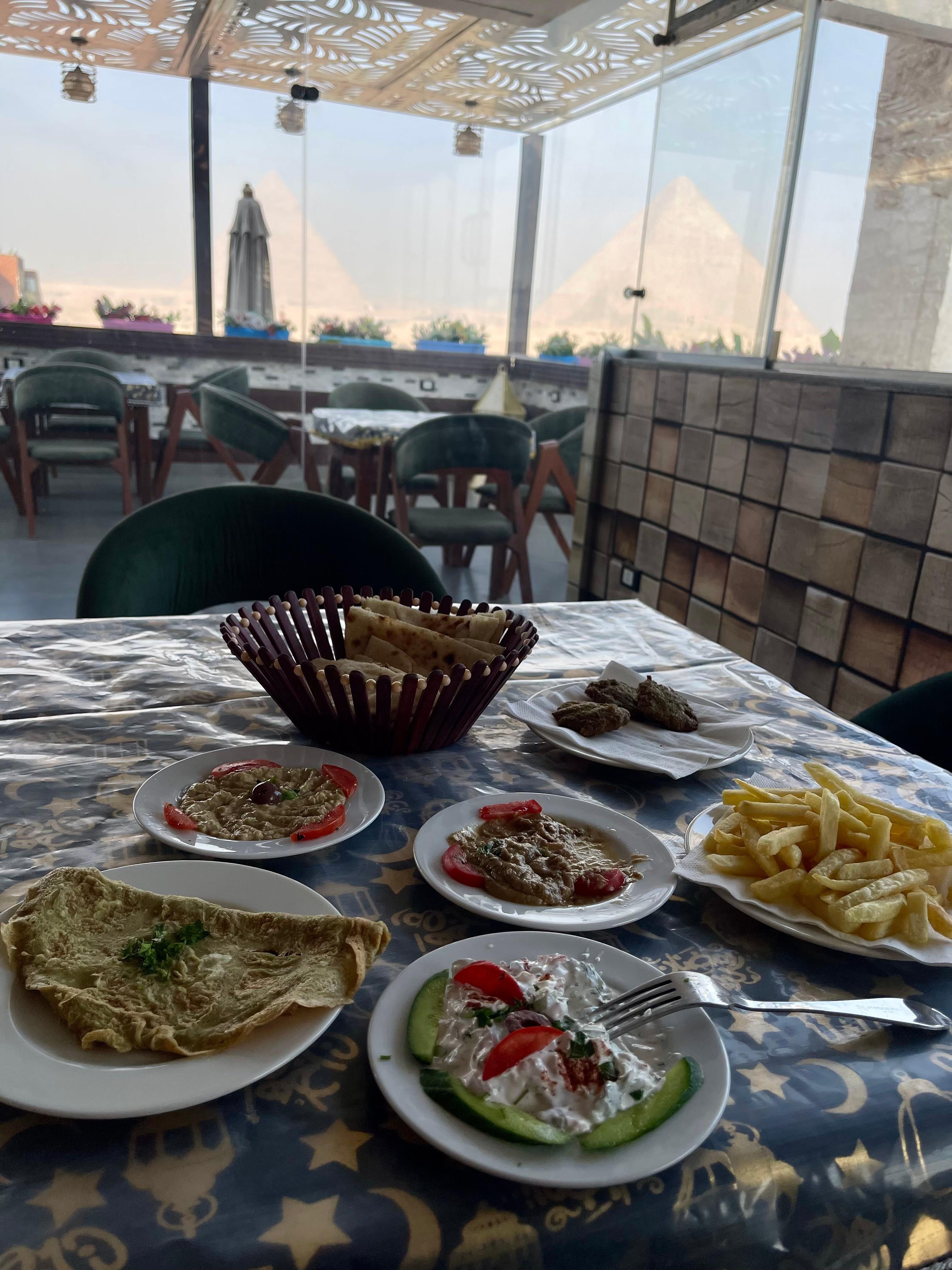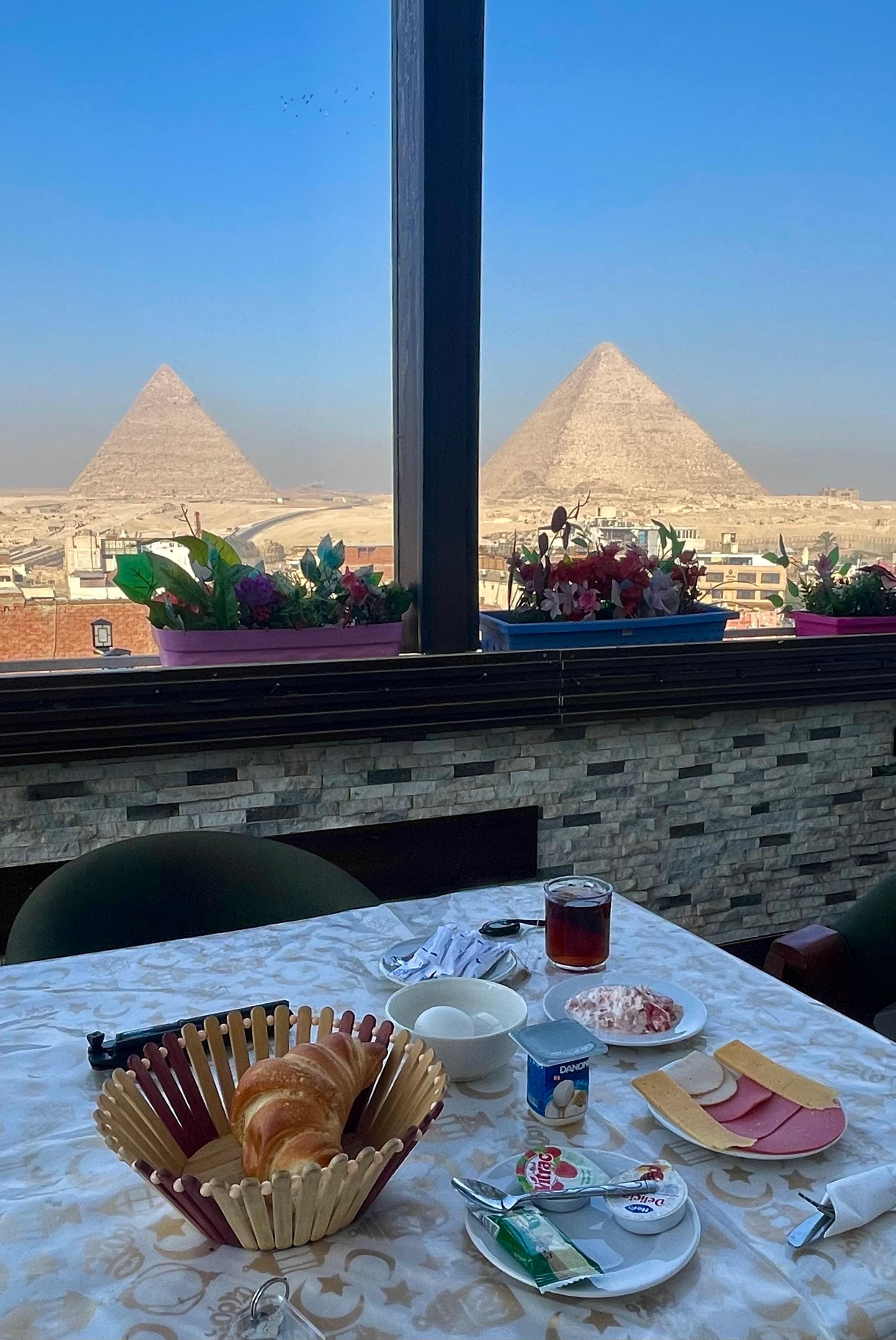 Let me start with all the positives to the Pyraking. The front desk staff is there to assist in transportation, questions, and even walked us to the Pyramids one day. Top notch service in this department. The rooftop views are incredible and the beds are fairly comfortable. The shower and bathroom also excellent. Their driver Mohammed picked us up at the airport and returned us there as well. He was incredible and even felt like family. Couple of negatives as well. First the internet was so-so at best and cellular wasn’t much better. We did find this problem in Luxor as well. Maybe we were spoiled by a well-made breakfast at other places, but the breakfast felt cheap and commercial consisting of processed meat, cheeses and yogurt. Oh and we were there during Ramadan so the noise was deafening. As a whole I liked this place and the price and location were great.