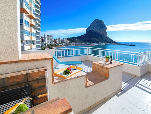 "Casita Blanca", 4-room penthouse 97 m2 on 2 levels, on the top floor. Spacious and bright, partly renovated in 2025, practical and comfortable furnishings: living/dining room with digital TV, air conditioning and forced-air heating. Exit to the terrace. 1 room with 1 french bed (1 x 150 cm, length 190 cm), air conditioning and forced-air heating. Exit to the terrace. 1 room with 2 beds (90 cm, length 190 cm), air conditioning and forced-air heating. Kitchen (oven, dishwasher, 3 ceramic glass hob hotplates, toaster, kettle, microwave, electric coffee machine). Bath/shower/WC. Upper floor: 1 room with 1 french bed (1 x 150 cm, length 190 cm), air conditioning and forced-air heating. Exit to the terrace. Bath/WC. Large terrace 66 m2. Terrace furniture, barbecue. Panoramic view of the sea and the city. Facilities: washing machine, iron, children's high chair, baby cot for up to 2 year olds, hair dryer. Internet (WiFi, free). Parking space n 1 (roofed, 1 car), height 250 cm, width 520 cm. Please note: smoke alarm. VT-496022-A // Reg. Nr.: ESFCTU00000302900042026400000000000000000VT-496022-A0