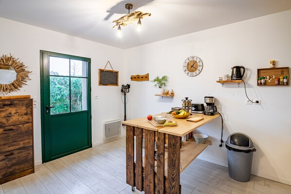- Equipped kitchenette open to the living room: oven, fridge, freezer, hob, microwave, coffee maker, kettle, toaster, crockery and cutlery, dining area with table for 4 people.