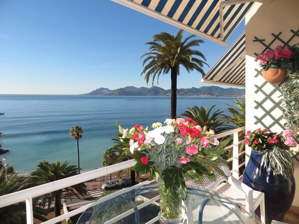 The apartment faces the sea directly with the old port of Cannes to the left, the mountains of the Esterel to the right, and the lovely islands of Lérins in front of you. Cleverly placed mirrors magnify the gorgeous sea view. The living-room/dining-room area is spacious and so comfortable that with the continuous presence of the sea through windows and mirrors we get the floating feeling of being in the stateroom of a luxurious cruise ship. The well-equipped kitchen makes you want to unleash your culinary skills. The famous covered market is just down the street, and the Neapolitan Rue Ménadier with all of its delicious food shops just beyond the market. Not only is the apartment central to the food markets, traiteurs and bakeries, it is also just a short walk from the great clothes shopping streets of Cannes, from the bargains on the Rue Ménardier, the trendy boutiques of the rue d'Antibes or designer stores on the Croisette. When you step out of the apartment you go directly to the sea through a little passage and across the street is the beach and its restaurants, or you can turn to the left and walk by the old port, with its own coterie of restaurants, and then you are in sight of the Palais des Congrès of festival fame, and the world famous Croisette whose whole landscape changes as the day unfolds, from locals on their bicycles with their baguette and newspaper (and dog) always ready for a chat, to children and edgy youth on rollerblades, the elderly well-dressed, tourists clicking away at selfies. As we attended several performances at the Palais des Congrès, we marvelled at being able to walk, sharing balmy evenings on the sidewalks and cafes with other strollers in a real resort relaxed atmosphere. Getting breakfast downstairs at one of the restaurants or going for a quick delicious lunch when we didn't want to cook was also a great convenience. We took pictures throughout the day: the sea changes color, the clouds move, the colors range from navy blue to turquoise, the cruise ships come and go, the sailboat school flotillas with hapless beginners offer endless entertainment, the golden light of the morning shifts into burnished tones in the evening. It is an endless spectacle. This apartment is a gem, perfect for an entry into the world of Cannes or a repeat visit. We have been coming to Cannes for many years and this is the best apartment we have rented. Mr and Mme Giry were perfect hosts, very caring about the quality of our stay.