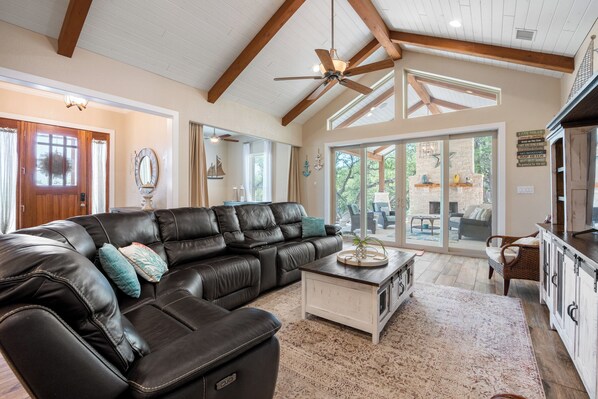 Inside the home, you'll be greeted by a huge vaulted ceiling, complete with tongue and groove finish, and large wood beams. The living room features a large reclining sectional sofa, perfect for family movie night, a large flat screen TV, DVD player, kids movies, board games, and card games. The kitchen boasts a huge 9 ft + island, stainless steel appliances, and a coffee/tea/hot cocoa bar, with plenty of seating for all your friends and family.