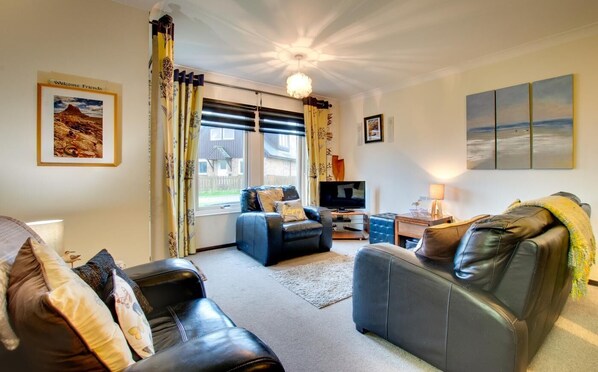 - 2 bedrooms – 1 king-size, 1 double with single bunk above - 1 bathroom with walk-in shower and WC - Electric cooker and hob with extractor fan, microwave, fridge/freezer, dishwasher, washer/dryer - Highchair and cot available on request when booking - TV/DVD, digi-box - Please bring or request to hire your own beach towels - Dogs are welcome but please note that outdoor spaces are unfenced, please keep dogs out of bedrooms and off of furniture, and only leave your dog unattended if they are crated (crates, dog beds and duvets can be arranged upon request) - Open lawn area, bench seating, a small, covered patio with bistro table and chairs - Private parking available - Shop and pub 0.5 miles, beach 0.1 miles